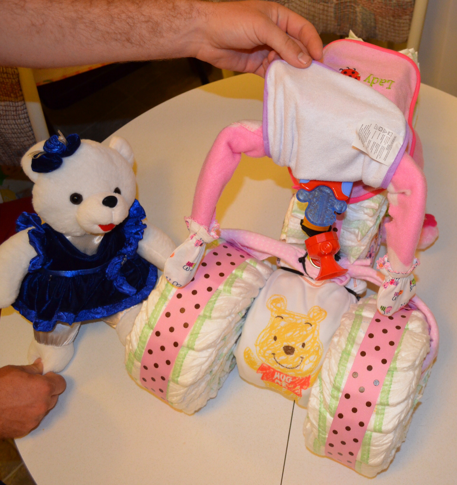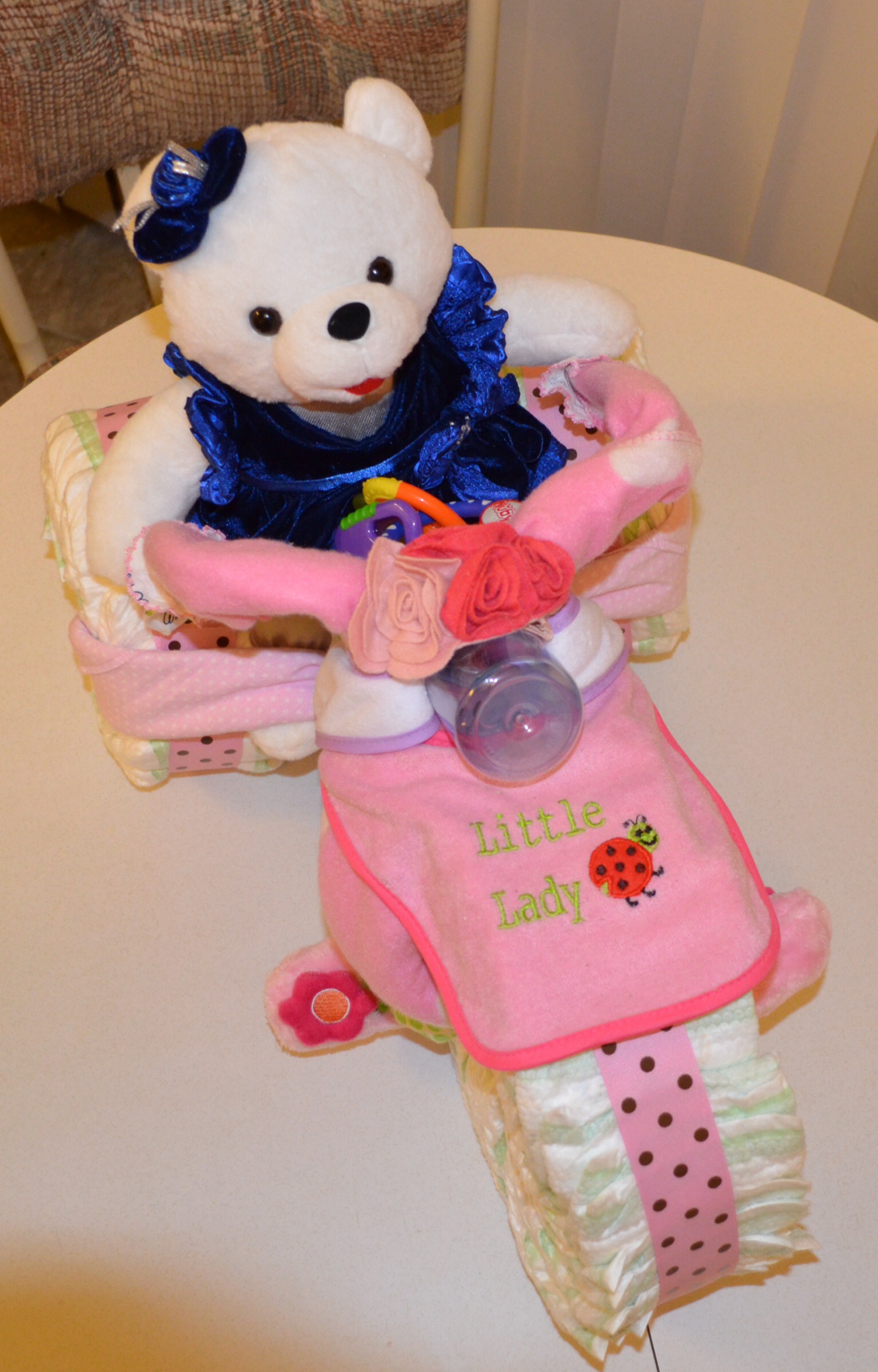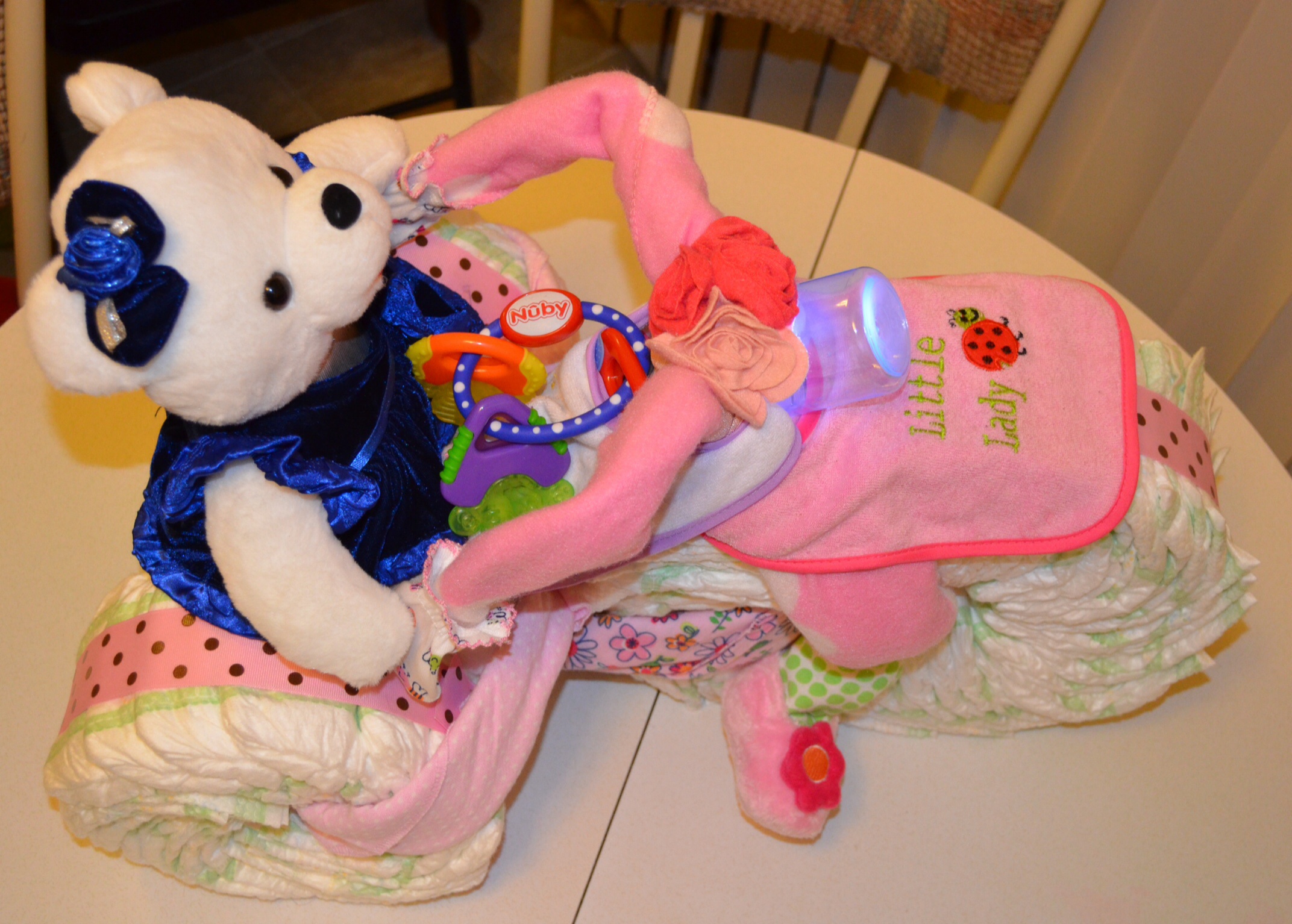 Diaper cakes are a great gift for any baby shower! It's a simple way for hostesses to give several gifts and it doubles as an adorable decoration for the party. This diaper cake is bigger than most with about 75 diapers, 3 receiving blankets, 2 bibs, a bottle, teething toy keys, 1 pair of mittens and booties, a onesie, a headband or bow tie, and 1 medium-sized plush animal. A working horn and headlight can be added for an extra $15. This product is made to order so you will be able to choose colors and/or themes.